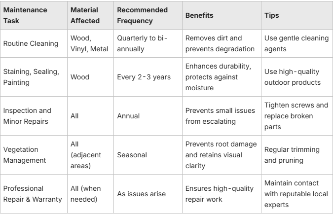 Below is a table summarizing the key maintenance steps and considerations for different fencing materials.